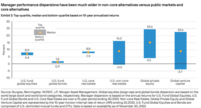 The chart below from JP Morgan shows that adding alternatives can improve returns and reduce risk (even with the median alternatives returns).